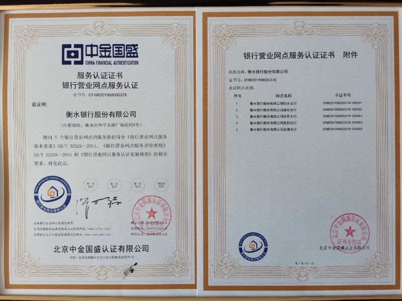 為貫徹落實(shí)《中華人民共和國標(biāo)準(zhǔn)化法》,推進(jìn)《銀行營業(yè)網(wǎng)點(diǎn)服務(wù)基本要求》和《銀行營業(yè)網(wǎng)點(diǎn)服務(wù)評(píng)價(jià)準(zhǔn)則》兩項(xiàng)國家標(biāo)準(zhǔn),衡水銀行2019年啟動(dòng)了金融標(biāo)準(zhǔn)化銀行營業(yè)網(wǎng)點(diǎn)服務(wù)認(rèn)證工作,2020年3月30日收到北京中金國盛認(rèn)證有限公司頒發(fā)的《銀行營業(yè)網(wǎng)點(diǎn)服務(wù)認(rèn)證》證書。衡水銀行轄內(nèi)五家銀行營業(yè)網(wǎng)點(diǎn)的服務(wù)提供符合《銀行營業(yè)網(wǎng)點(diǎn)服務(wù)基本要求》GB/T 32320-2015、《銀行營業(yè)網(wǎng)點(diǎn)服務(wù)評(píng)價(jià)準(zhǔn)則》GB/T 32318-2015和《銀行營業(yè)網(wǎng)點(diǎn)服務(wù)認(rèn)證實(shí)施規(guī)則》的相關(guān)要求,順利通過中金國盛標(biāo)準(zhǔn)化認(rèn)證。