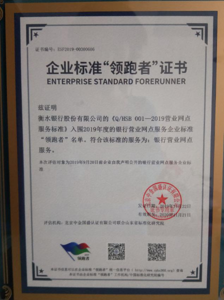 衡水銀行榮獲2019營業(yè)網(wǎng)點服務(wù)領(lǐng)域企業(yè)標(biāo)準(zhǔn) “領(lǐng)跑者”榮譽(yù)稱號